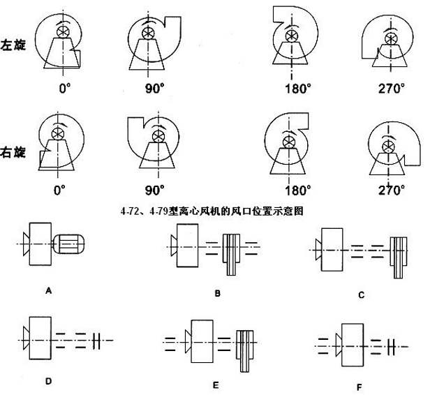·公司所有離心風(fēng)機(jī)全部采用訂單制生產(chǎn),根據(jù)客戶的使用需求,為您量身定制,讓您買的稱心用的放心。風(fēng)機(jī)分左旋和右旋兩種型式,從電機(jī)(皮帶輪)側(cè)正視,葉輪按順時(shí)針方向旋轉(zhuǎn)為右旋,逆時(shí)針旋轉(zhuǎn)為左旋。A式為點(diǎn)擊直聯(lián)傳動(dòng)。B、C、E式為皮帶傳動(dòng),D、F式為聯(lián)軸器傳動(dòng)。